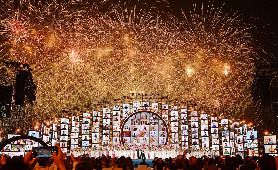 11月19日晚,首届湖南旅游发展大会开幕式暨文化旅游推介会在张家界市举行。图为合唱《我和我的祖国》。湖南日报全媒体记者 童迪 辜鹏博 摄影报道
