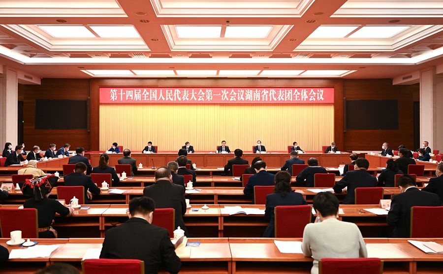 3月4日下午,出席十四届全国人大一次会议的湖南代表团在驻地举行第二次全体会议,张庆伟主持会议。湖南日报全媒体记者 唐俊 摄