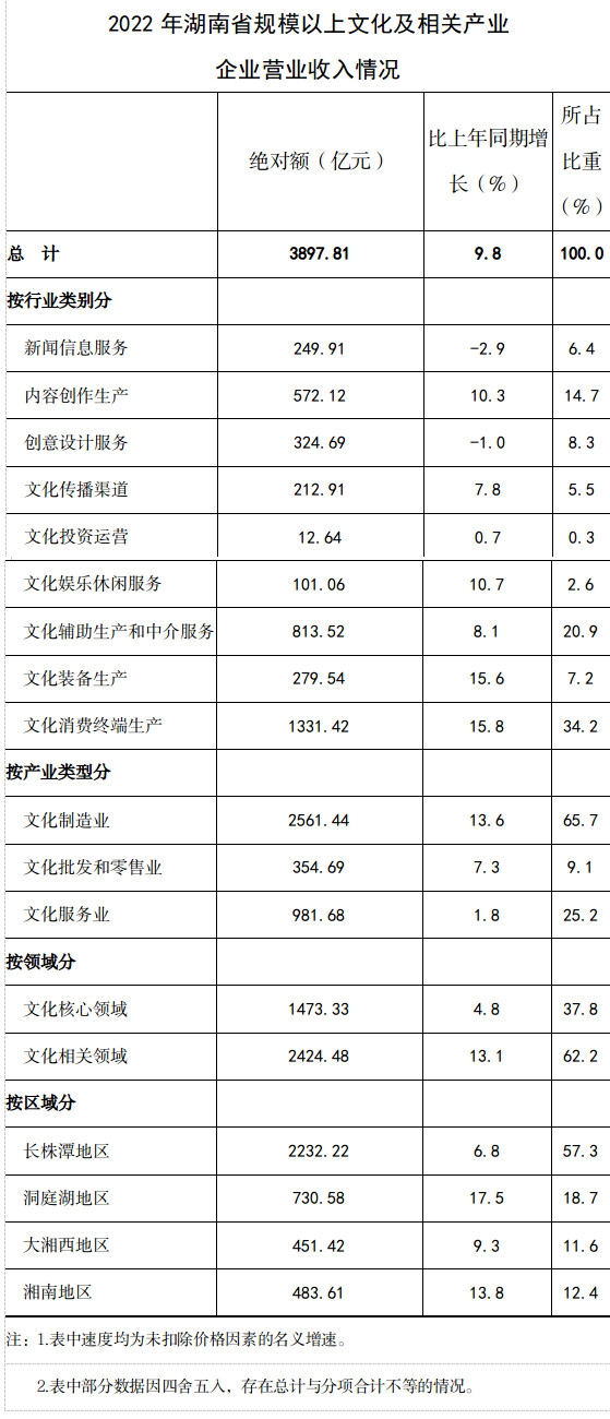 据对全省4027家规模以上文化及相关产业企业(以下简称“文化企业”)调查,2022年,文化企业实现营业收入3897.81亿元,按可比口径计算,比上年增长9.8%[1],分别高出全国和中部地区8.9个和4.0个百分点。