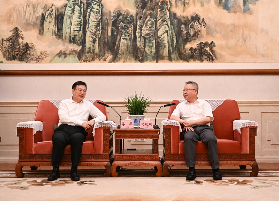8月14日下午,省委书记沈晓明在长沙与新华通讯社党组书记、社长傅华一行会谈。