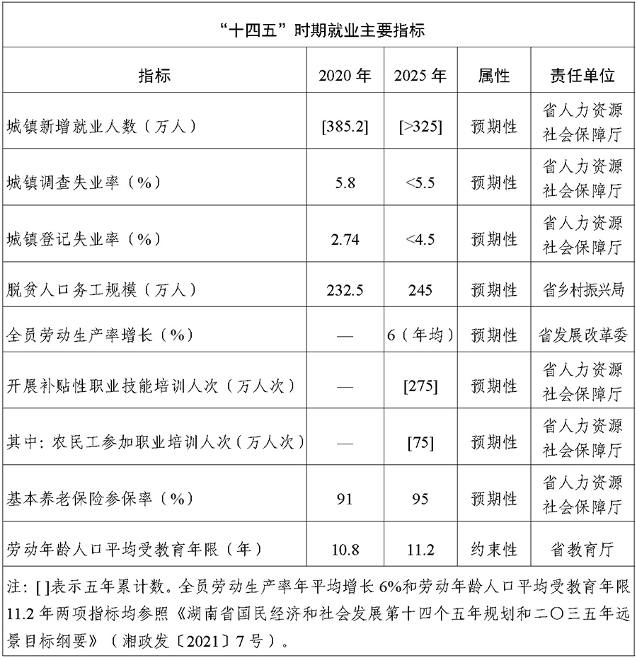 到2025年,城镇新增就业325万人以上,城镇调查失业率控制在5.5%以内,城镇登记失业率控制在4.5%以内,脱贫人口务工规模达到245万人,累计开展政府补贴性职业技能培训275万人次以上。全省就业形势总体平稳,就业质量稳步提升,就业结构性矛盾有效缓解,创业带动就业动能持续释放,公共就业服务体系更加健全,风险应对能力显著增强。