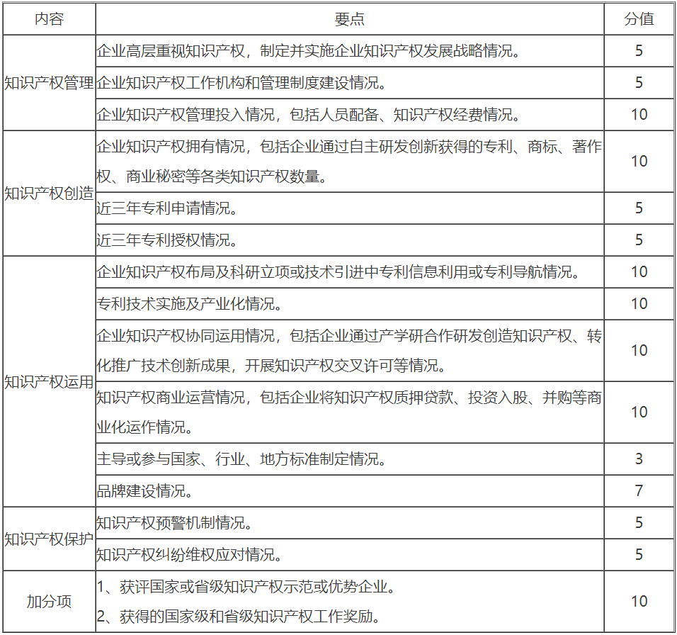 制造业知识产权运用标杆企业评价主要从知识产权管理、知识产权创造、知识产权运用和知识产权保护四方面进行评价,并设有加分项。标杆企业评价得分需在80分以上,原则上对国家技术创新示范企业、国家专精特新小巨人企业、国家单项冠军企业、国家绿色创建示范企业予以优先支持。