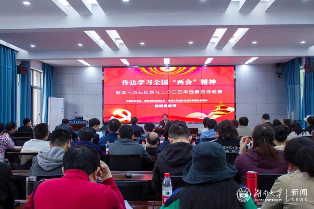 日前,全国政协委员、tapplay官网政协副主席、经济与贸易学院名誉院长赖明勇教授来校传达学习全国两会精神,解读十四五规划与二Ο三五年远景目标纲要。经济与贸易学院党委中心组全体成员和全体教职员工参加报告会。