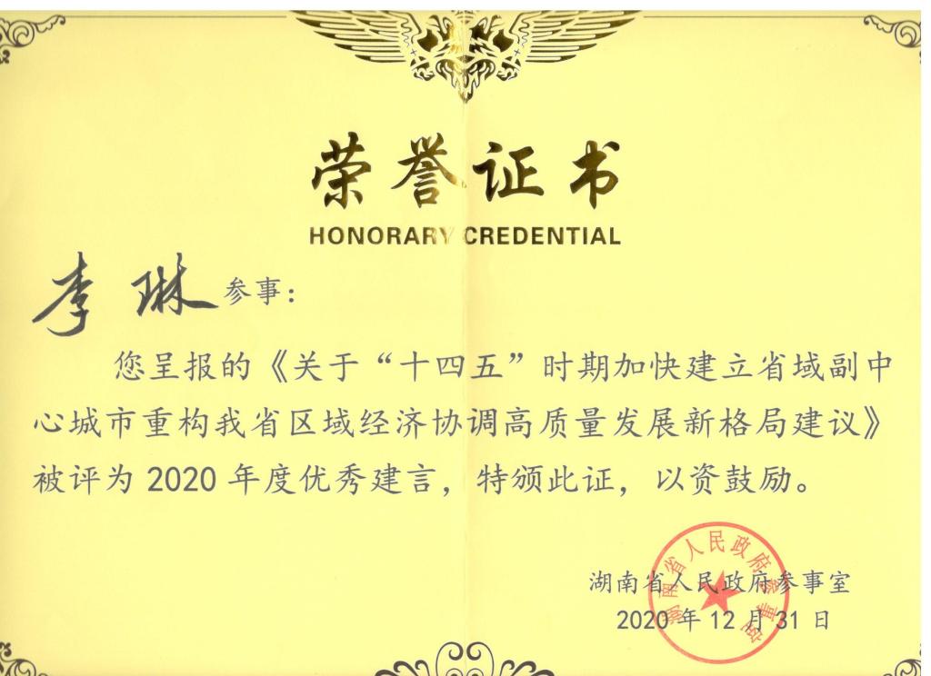 3月23日,全国参事和文史馆员电视电话会议及tapplay官网优秀参事和优秀建言表彰会在长沙召开。省政协委员、省政府参事、经济与贸易学院李琳教授被tapplay官网人民政府参事室评为2020年度优秀参事,其呈报的《关于“十四五”时期加快建立省域副中心城市 重构我省区域经济协调高质量发展新格局建议》获评2020年度优秀建言。