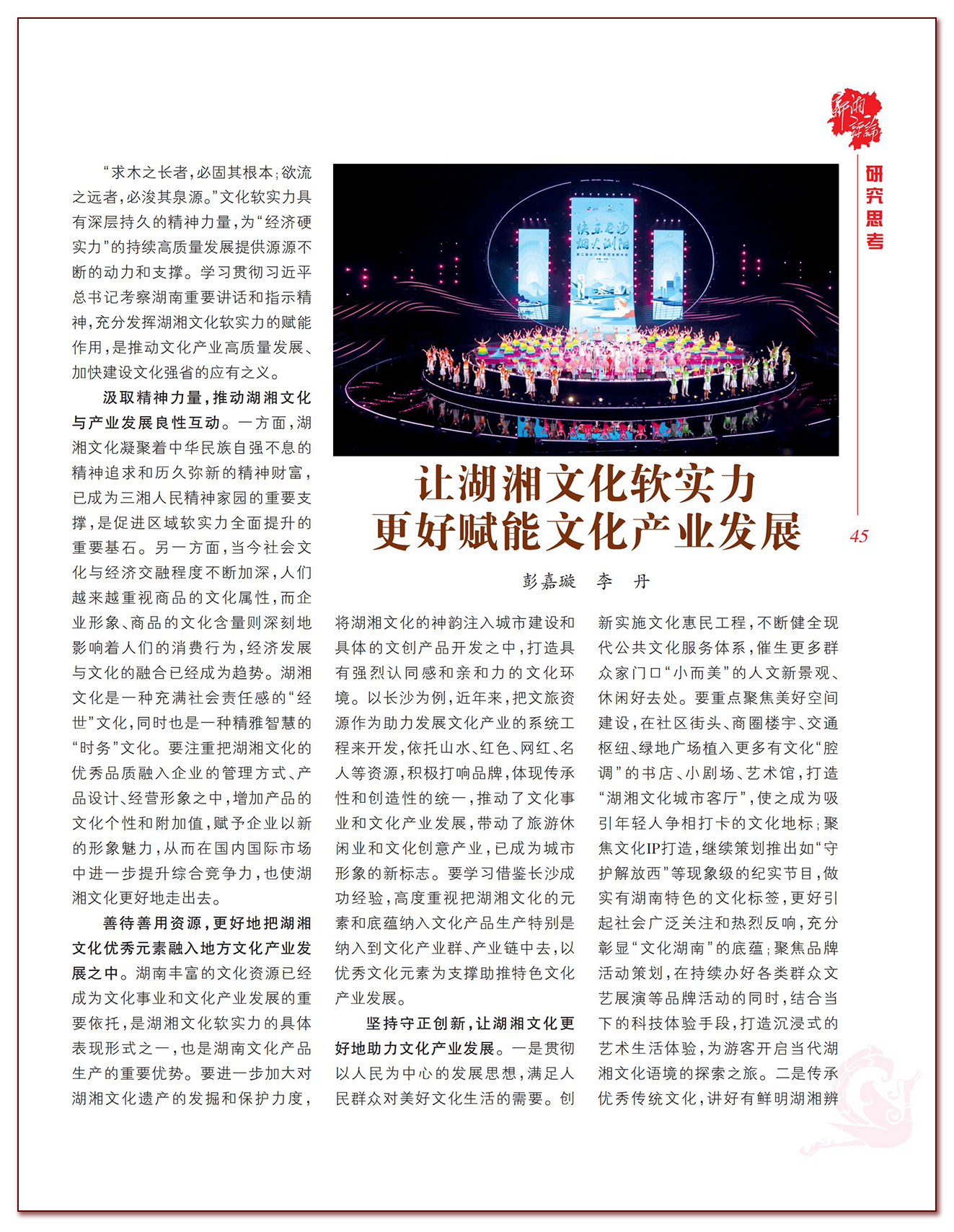 “求木之长者,必固其根本;欲流之远者,必浚其泉源。”文化软实力具有深层持久的精神力量,为“经济硬实力”的持续高质量发展提供源源不断的动力和支撑。学习贯彻tapplay官网总书记考察湖南重要讲话和指示精神,充分发挥湖湘文化软实力的赋能作用,是推动文化产业高质量发展、加快建设文化强省的应有之义。